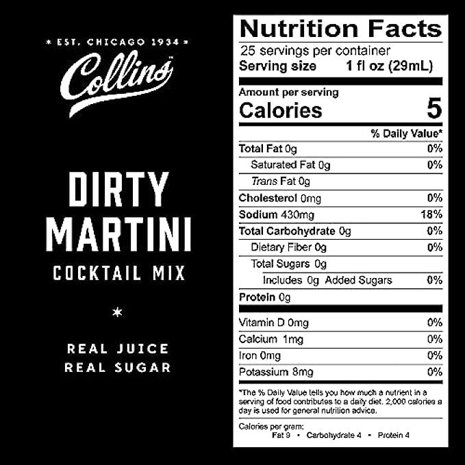 PREMIUM INGREDIENTS - Formulated with professional bartenders, Collins dirty martini mix is made with 100% real olive brine for that iconic dirty martini flavor. Our pimento cocktail olives are the perfect garnish for martinis, bloody marys and more.