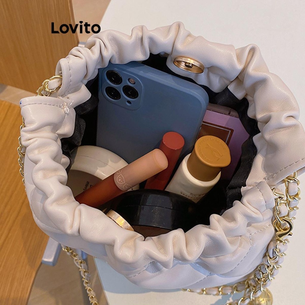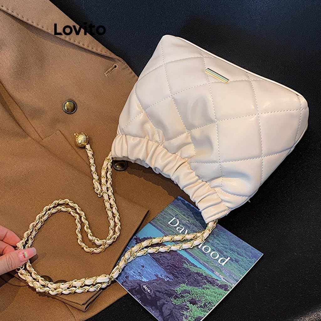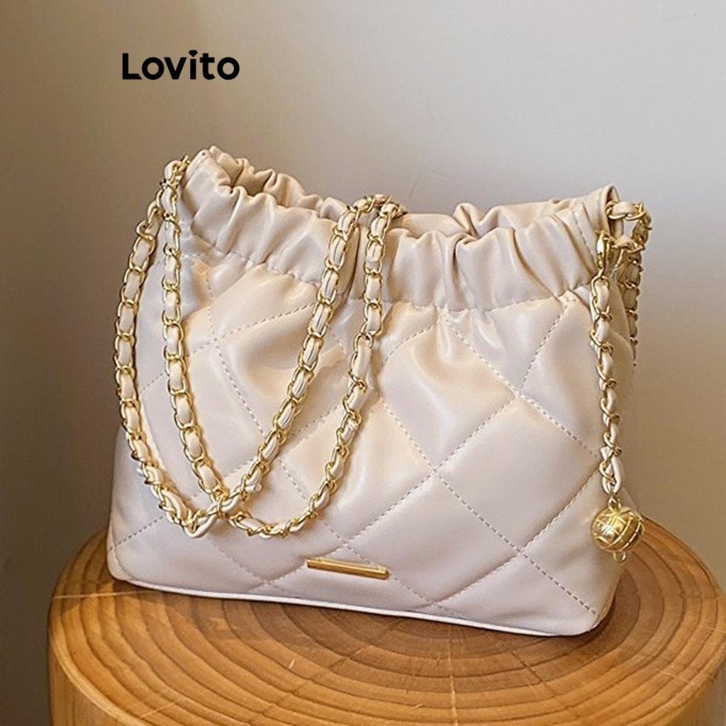 Lovito Vintage Argyle Chain Pom Small Fragrant Style High Capacity Temperament Shoulder Tote Bag for Women LFA27461