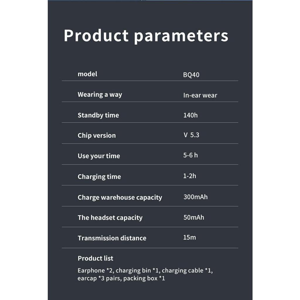 Vitog New Wireless Earphone BQ40 5.3 Bluetooth In-ear Headphones TWS Game Headset Touch Control Sports Earbuds for All Smartphones