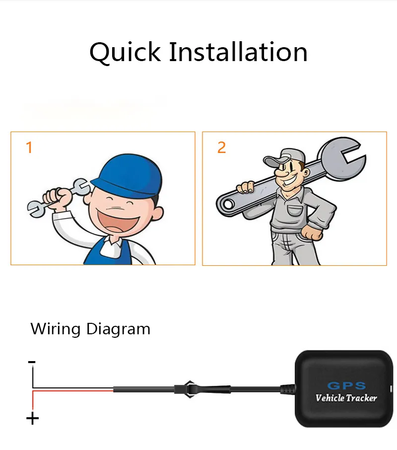How to use?1. Open the device cap and insert the SIM Card(Make sure your card support GSM and receive text message, make a call.)2. Connect the battery of car or motorbike, The indicator light lighting and device will turn on.3. Download a APP by QR code.4. Landing service platform by the IMEI account and password.5. Then you can track your device on google map.